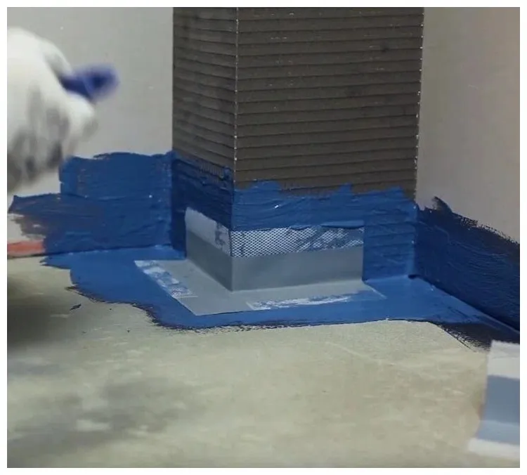 Нанесите на обрабатываемую поверхность слой гидроизоляционного состава (например, в линейке PLITONIT вы найдете мастики PLITONIT ГидроЭласт, PLITONIT WaterProof Premium). Вдавите в него угловой элемент гладким металлическим (пластиковым) шпателем или валиком, чтобы удалить все воздушные «пузыри». Следующий слой гидроизоляционного состава наносят поверх сетчатой части угла. Угловой элемент стыкуется с гидроизоляционной лентой гидроизоляционным составом внахлест на 5 см: сначала укладывается угол, на него сверху накладывается лента. Внутренний и внешний углы представляют собой эластомер, нанесенный на полиэфирную сетку.