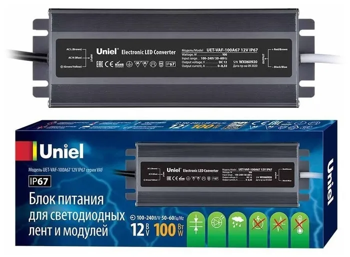 UET-VAF-100A67 12V IP67 Блок питания ультратонкий, 100Вт. Металлический корпус. TM Uniel