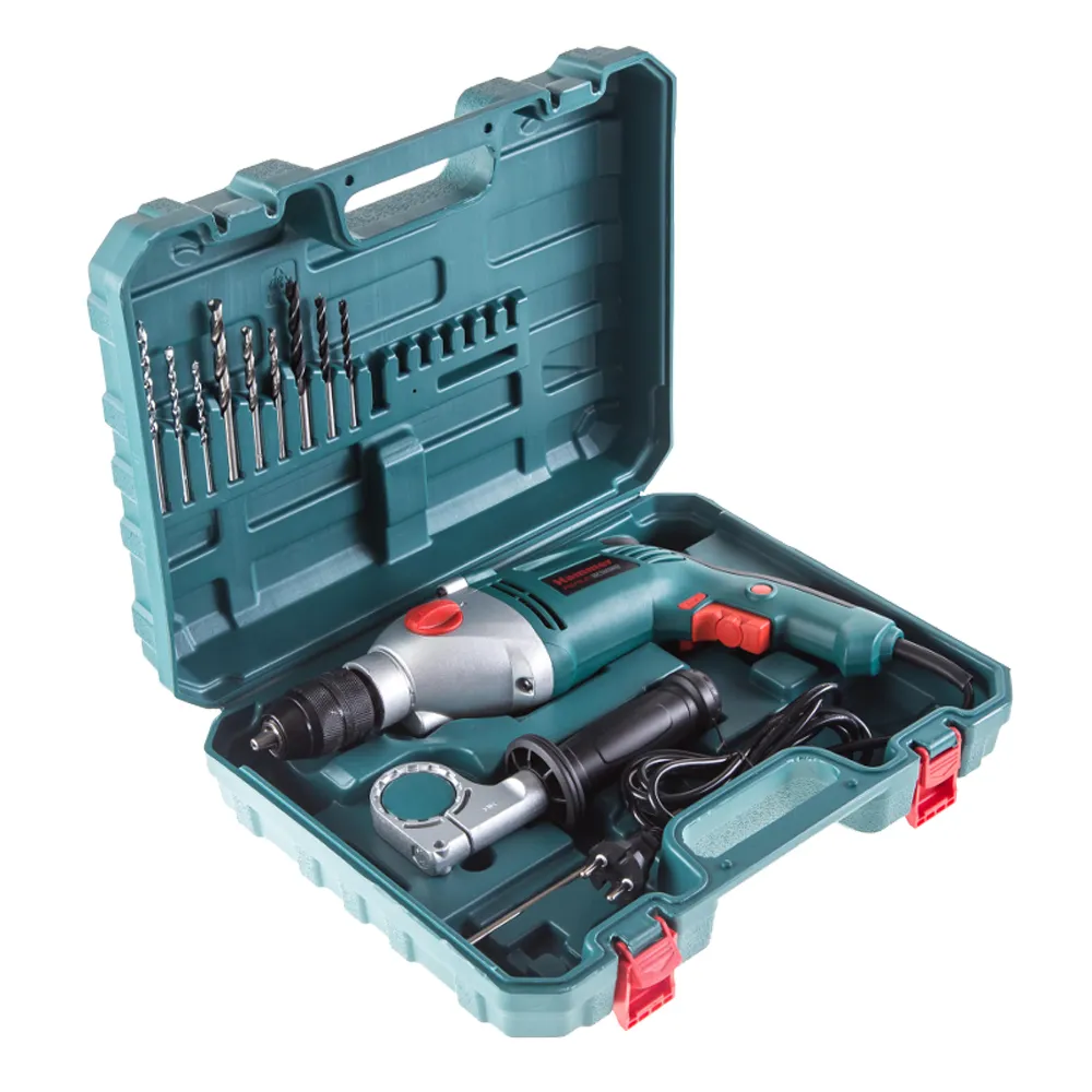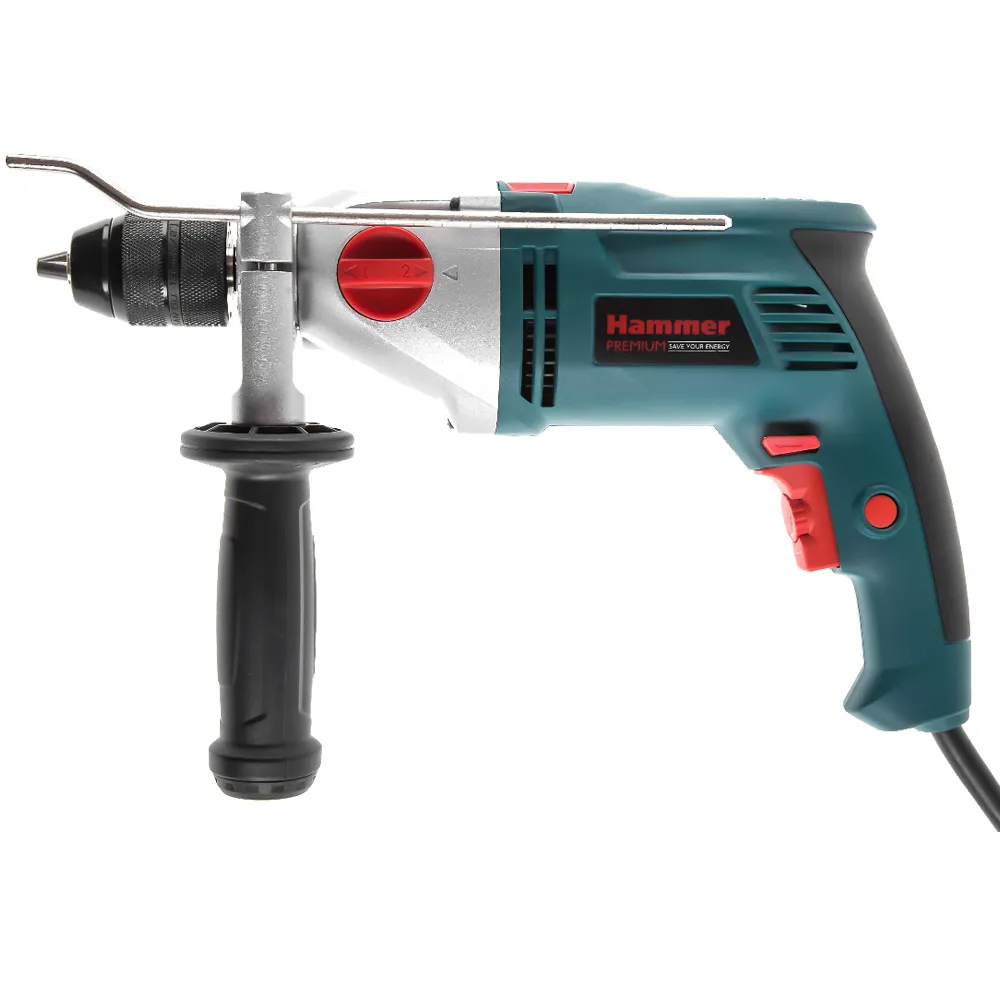 Дрель ударная HAMMER UDD1100B, предназначена для сверления отверстий в разных материалах. Высокая (1100 Вт) мощность модели, сочетающаяся с наличием ударного механизма, дает возможность сверлить отверстия в бетоне. Диаметр отверстий в бетоне и кирпиче может достигать внушительных 16 мм. Максимальный диаметр сверления металла равен 13 мм. Соответствующий показатель для древесины – 30 мм. Во многих случаях вам будет крайне полезна функция реверса. Полезным фактором является и наличие функции блокировки кнопки включения. Дрель имеет дополнительную рукоятку, с помощью которой можно значительно повысить качество сверления при работе с твердыми материалами. В комплектацию модели входят ограничитель глубины сверления, набор сверл и руководство по эксплуатации. Инструмент получает питание от сети, подключение к которой производится с помощью кабеля с прочной изоляцией. Дрель поставляется в кейсе, который оборудован удобной ручкой для переноски.