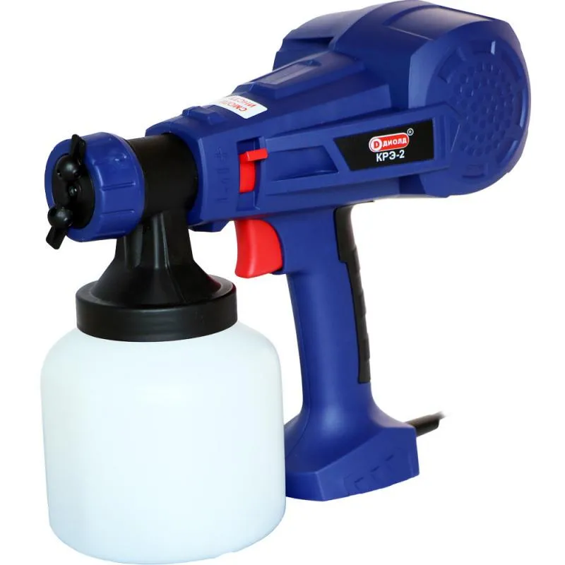 Электрический краскораспылитель ДИОЛД КРЭ-2 подходит для бытового использования. Уверенно работает с красками, грунтовками, лаками, защищающими древесину средствами. Оснащен удобной рукояткой с резиновой накладкой для надежного удержания при работе.