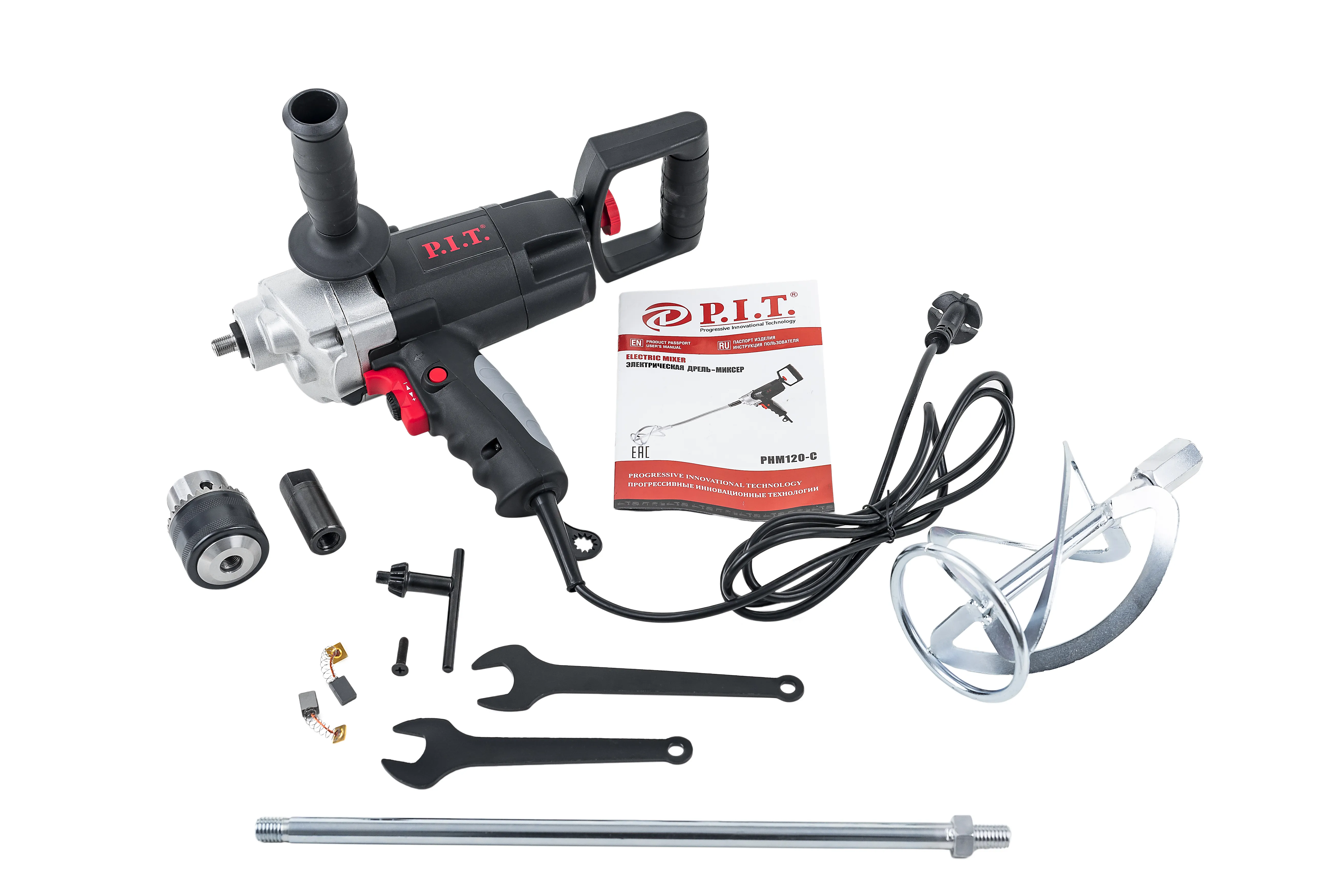 Дрель-миксер PHM120-C с ключевым патроном, в который устанавливаются сверла диаметром до 16 мм. Над кнопкой пуска располагается управление реверсом, который служит для управления вращением миксера. Так как приходится замешивать густые смеси, для лучшего удержания в руках, миксер укомплектован двумя рукоятками. Выключатель фиксируется в рабочем положении за счет клавиши блокировки, что позволяет не удерживать кнопку запуска длительное время.