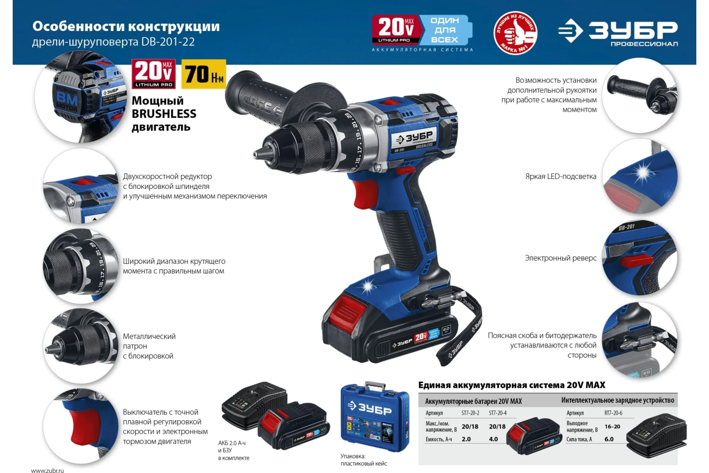 Бесщеточная дрель-шуруповерт ЗУБР Профессионал DB-201-22