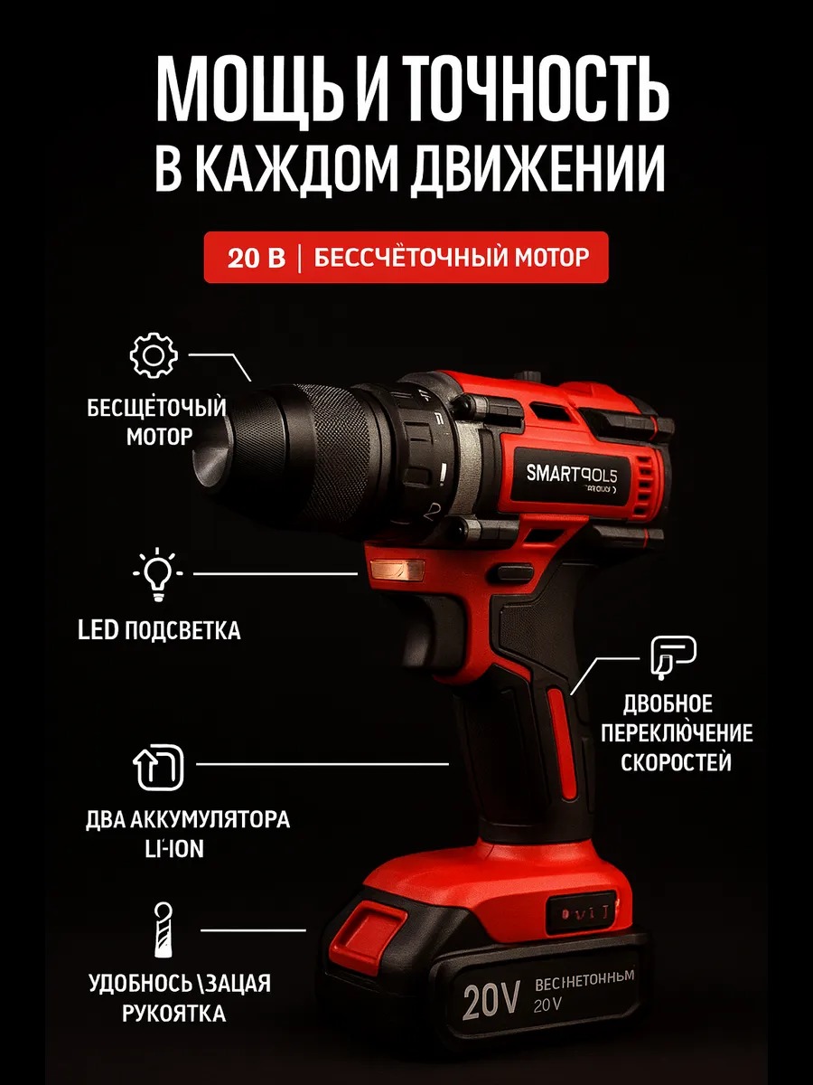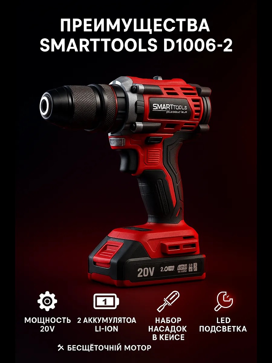 Бесщеточный двигатель увеличивает срок службы инструмента, снижает нагрев и делает работу тише. Оптимальная балансировка конструкции обеспечивает точность при закручивании и сверлении. Шуруповерт аккумуляторный SMARTTOOLS D1006-2 сочетает мощность, удобство и долговечность, что делает его незаменимым помощником как для домашних мастеров, так и для профессионалов.