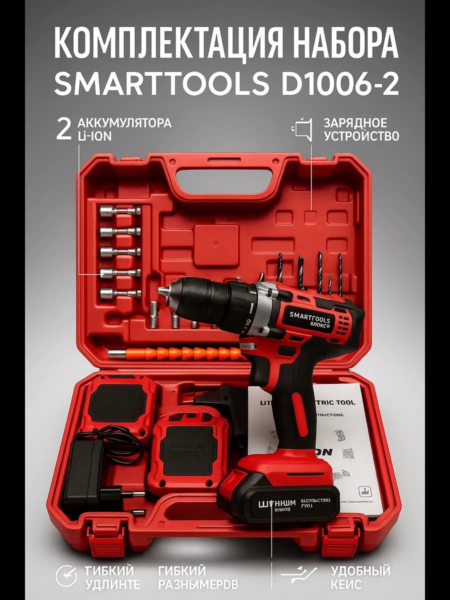 В комплект входят два аккумулятора Li-ion 2.0Ah, зарядное устройство, набор сверл и бит, гибкий удлинитель и ударопрочный кейс SMARTTOOLS. Полная комплектация позволяет сразу приступить к работе без необходимости докупать дополнительные аксессуары.