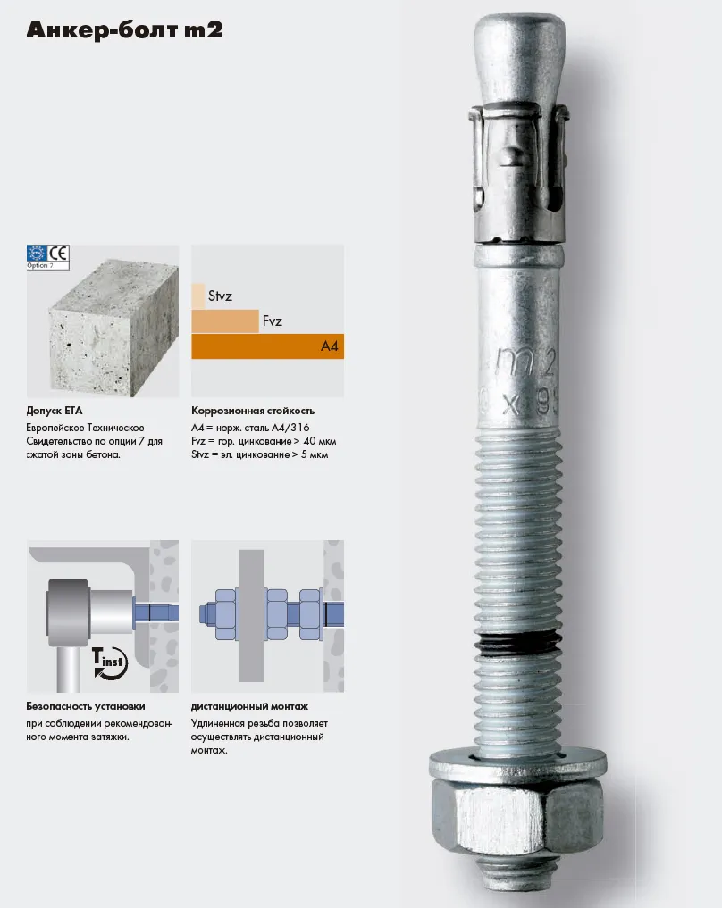 m2 Анкер-болт компании Mungo благодаря наличию сегментного распорного кольца, изготовленного из нержавеющей стали, обеспечивает надёжное крепление. Материал для самого анкера — углеродистая сталь с оцинковкой или нержавеющая сталь.