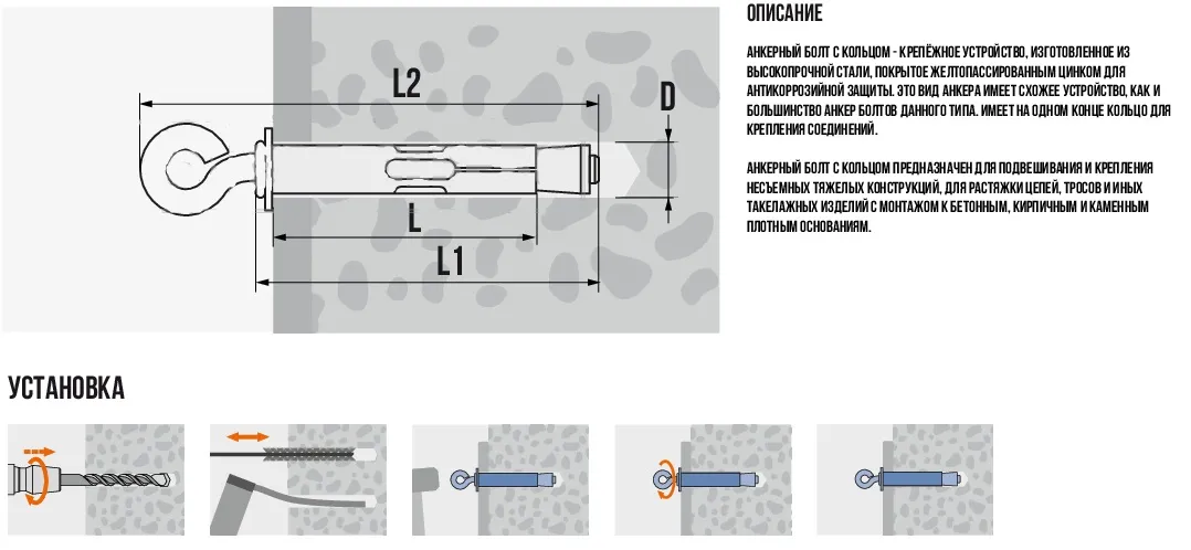 Данный вид анкера используют для крепления подвесных конструкций с применением гибких элементов, таких как цепи, тросы и канаты. Используются анкерные болты на строительных площадках. Изделие состоит из таких элементов как распорный конус с внутренней резьбой, болт с головкой-кольцом, гайка и распорный конус.Анкерный болт с кольцом пользуется большой популярностью, за счет удобства монтажа и надежности крепления.