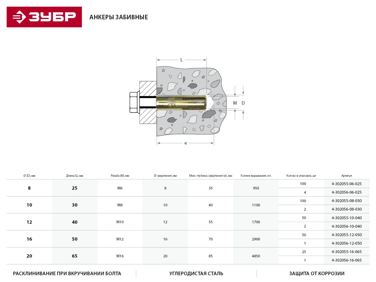 Анкеры забивные с внутренним конусом изготовлены из высококачественной стали. Обеспечивают более высокие вырывные нагрузки по сравнению с дюбелями и позволяют крепить различные элементы и конструкции к несущим основаниям. Конструкция анкера состоит из нераспорной части, которая не участвует в закреплении, и распорной (рабочей) зоны, которая изменяет свои размеры (форму). Анкеры изготовлены из высококачественной стали, что придает соединению повышенную прочность;