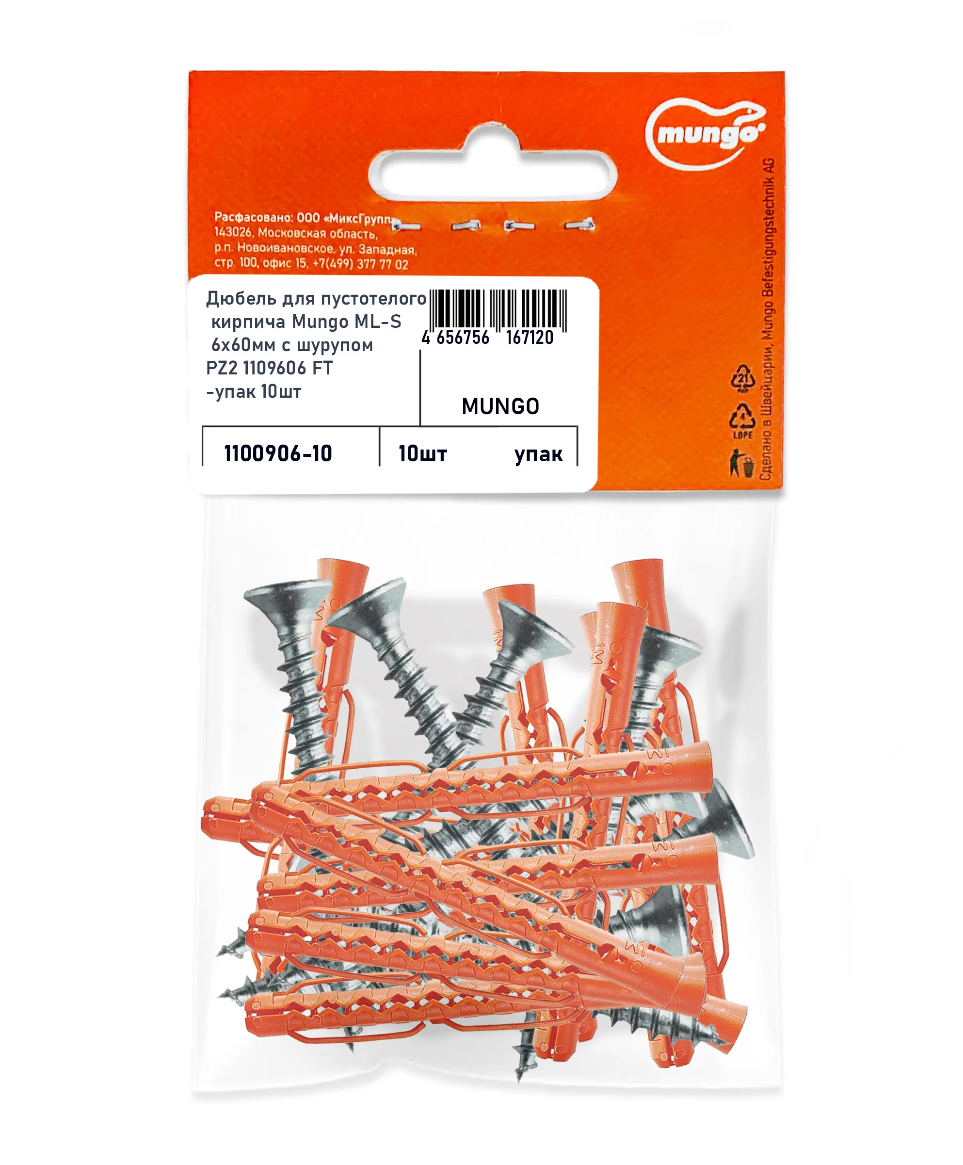Дюбель для пустотелого кирпича Mungo ML-S 6х60мм с шурупом PZ2 1109606 FT-упак 10шт