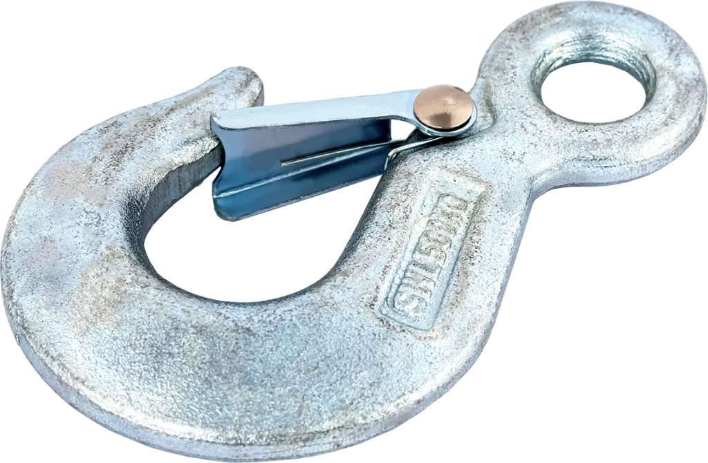 Крюки открытые DIN 689 с защелкой и проушиной используются на стройплощадках, в промышленном оборудовании. Для страховки от соскальзывания груза в конструкции предусмотрена блокировочная защелка, значительно повышающая безопасность. Трос подъемного механизма крепится стационарно за верхнее кольцо, а рабочая часть служит для зацепа.