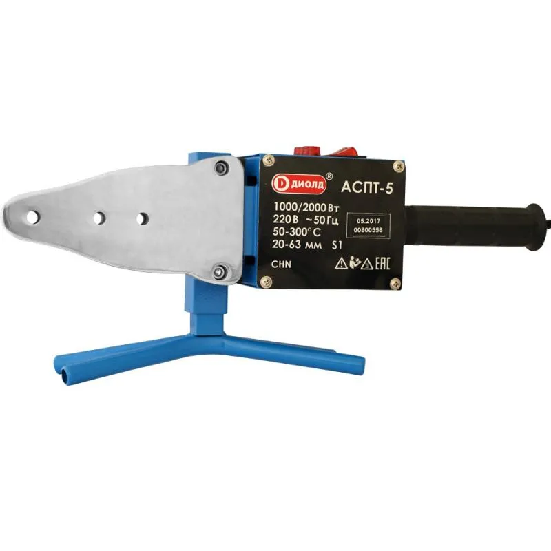 Сварочный аппарат Диолд АСПТ-5 отличается простой конструкцией, состоящей из трёх элементов: рукоятки, корпуса и мечевидного нагревателя. Для жёсткого фиксирования свариваемых пластиковых труб используется подставка и парные насадки нужного размера (20, 25, 32, 40, 50 и 63 мм). Данная модель имеет два режима мощности 1000/2000 Вт и поддерживает температуру нагревательного элемента от 50 до 300 градусов. Необходимые для работы принадлежности поставляются вместе с аппаратом в легком и компактном пластиковом кейсе.
