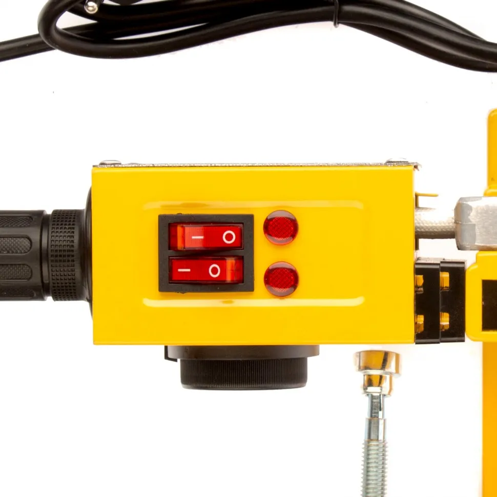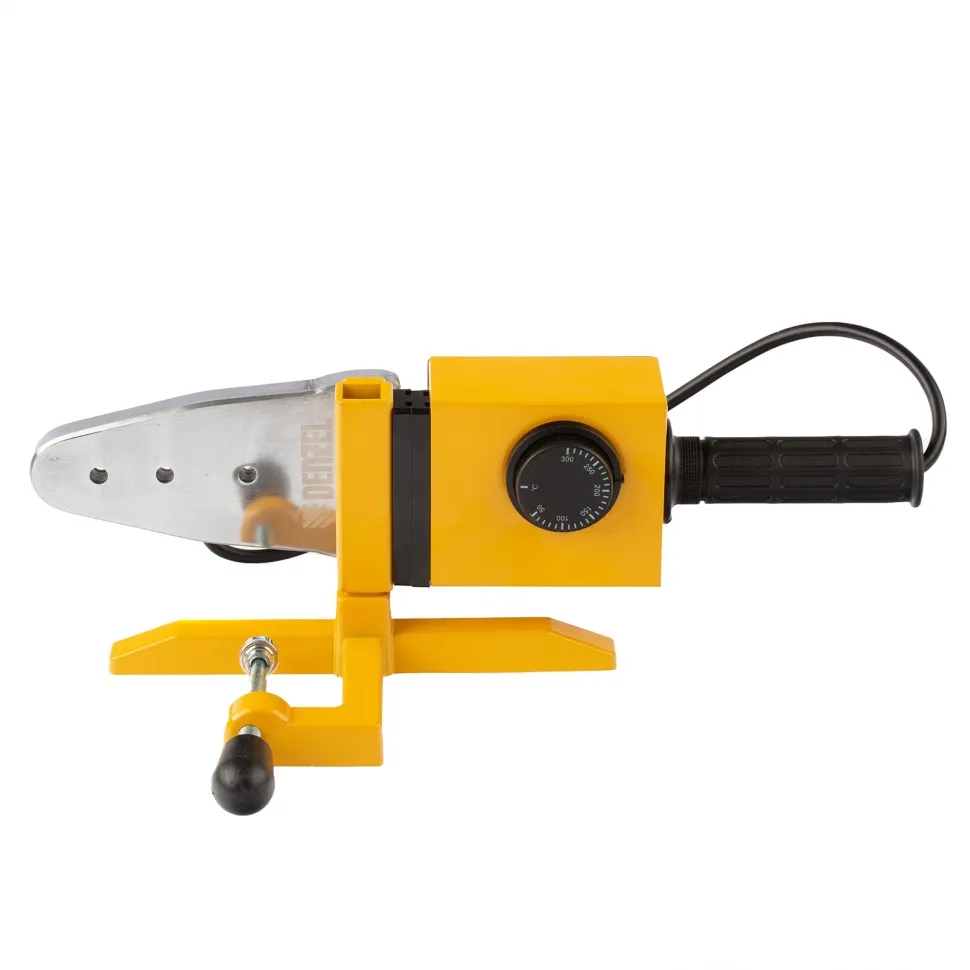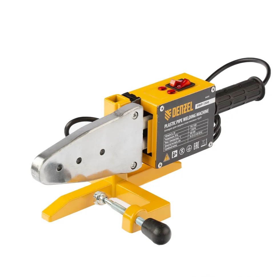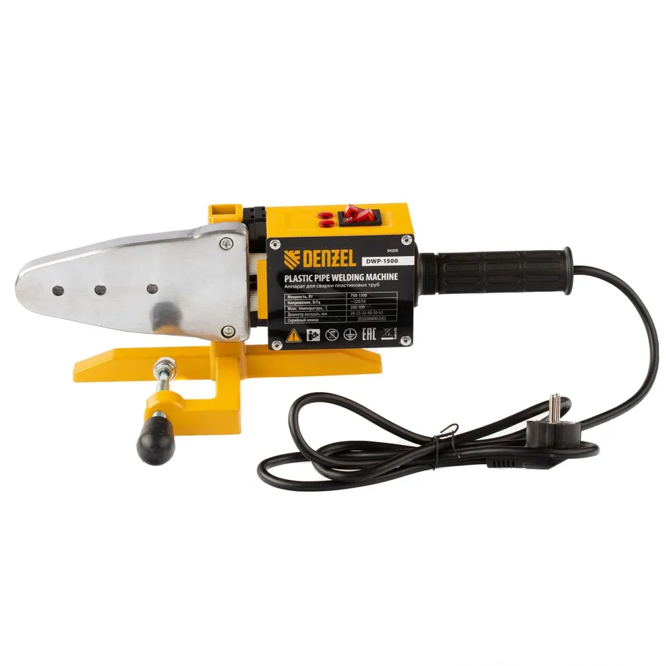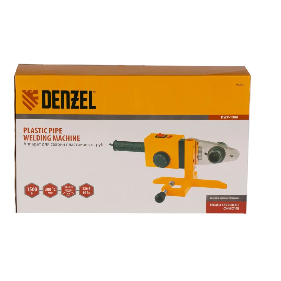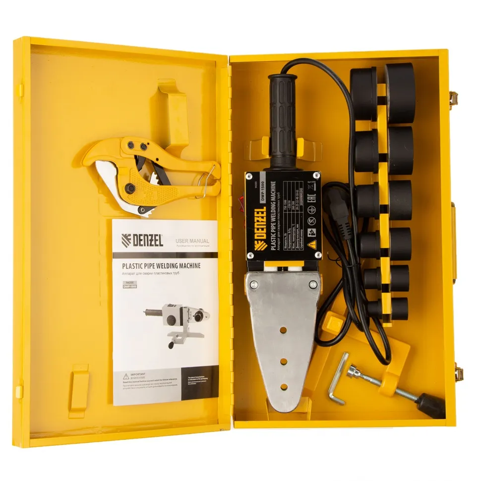 Аппарат для сварки пластиковых труб Denzel DWP-1500 предназначен для соединения полипропиленовых и полиэтиленовых труб в бытовых условиях. Он незаменим при ремонте и прокладке систем ГВС, ХВС и отопления, сантехнических работах с канализационными трубами и т.д. Мощность 1,5 кВт обеспечивает нагрев до 260-300 °C и поддержание температурного режима на протяжении всего рабочего процесса.Модель DWP-1500 питается от однофазной бытовой сети 220 В и имеет простой принцип работы, поэтому ее очень удобно использовать в квартирах и частных домах. 6 насадок в комплекте позволяют надежно соединять пластиковые трубы диаметром 20, 25, 32, 40, 50 и 63 мм.Преимущества:Быстрое начало работы - для настройки температуры надо просто повернуть регулятор до нужной отметки и подождать 3-4 минуты, пока аппарат нагреется.Кроме насадок в комплект поставки включен труборез, шпильки крепления и шестигранный ключ. Такое решение экономит ресурсы пользователя на поиск аксессуаров.Понятные тумблерные выключатели и индикаторы делают эксплуат