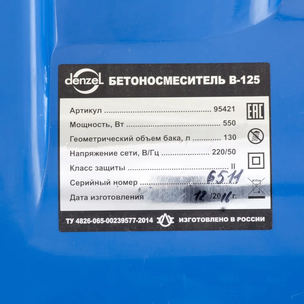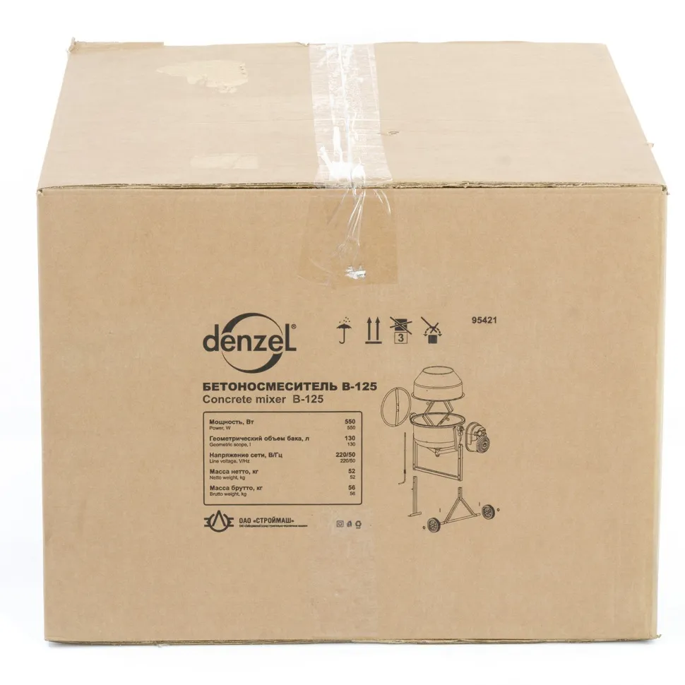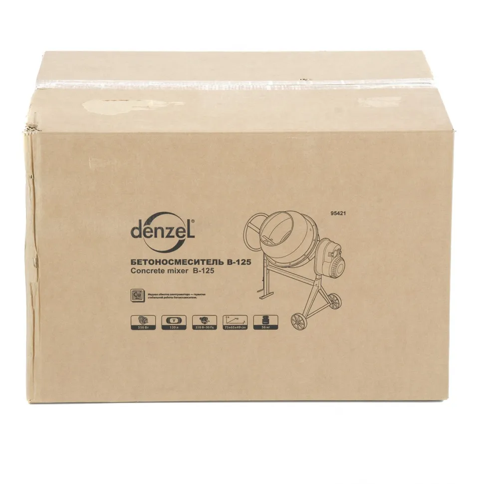 Бетоносмеситель Denzel B-125 95421 используется для приготовления раствора цемента, бетона или других смесей. Усиленная конструкция, оптимальное соотношение мощности двигателя 550 Вт и объема бака 130 л позволяют использовать устройство в режиме высокой нагрузки. Бетоносмеситель пригодится при проведении ремонтных работ и частном строительстве. Барабан объемом 130 л обеспечивает получение до 50 л готовой смеси (±10 %).ПреимуществаЗащита от перегрева — если неопытный пользователь перегрузит барабан, датчик термозащиты незамедлительно отключит питание, это позволит предотвратить повреждение обмотки двигателя.Долговечность — барабан выполнен из стальных листов увеличенной толщины (верх 1,5 мм / низ 2 мм) и покрыт порошковой краской для защиты от коррозии.Высокая металлоемкость конструкции — за счет применения усиленных узлов и элементов бетоносмеситель выдерживает повышенные нагрузки.Безопасная эксплуатация — ведущая шестерня закрыта широким защитным кожухом, предотвращающим затягивание посторонних предметов в п