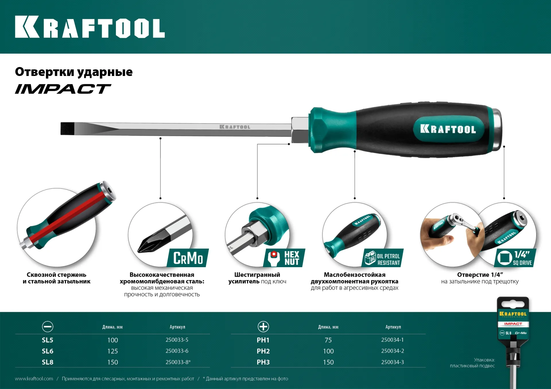 Отвертка ударная "Impact" сквозной стержень из Cr-Mo-V стали мбс рукоятка SL 6x125мм KRAFTOOL