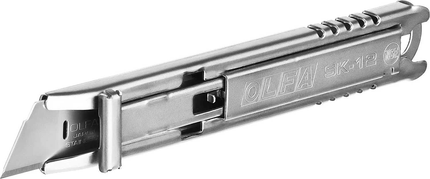 Нож OLFA SK-12 специально разработан для применения в пищевой промышленности и ресторанном бизнесе. Сертифицирован NSF благодаря возможности легко поддерживать его в чистоте любыми методами и составами, в том числе дезинфекция гипохлоритом натрия, за счет конструкции и лезвию SKB-2S из нержавеющей стали. Также, нержавеющая сталь обладает высоким коэффициентом намагничивания, что обеспечивает ножу более высокую точность нахождения металлодетекторами, чем у обычных ножей с пластиковыми рукоятками.