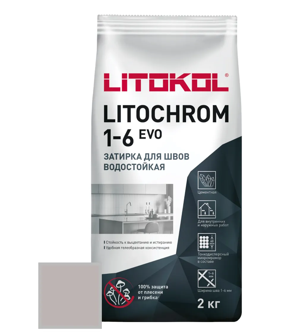 Litokol Litochrom 1-6 Evo — предназначена для затирки швов при облицовке стен и полов керамической плиткой, стеклянной мозаикой, керамогранитом, натуральным камнем, агломератом.