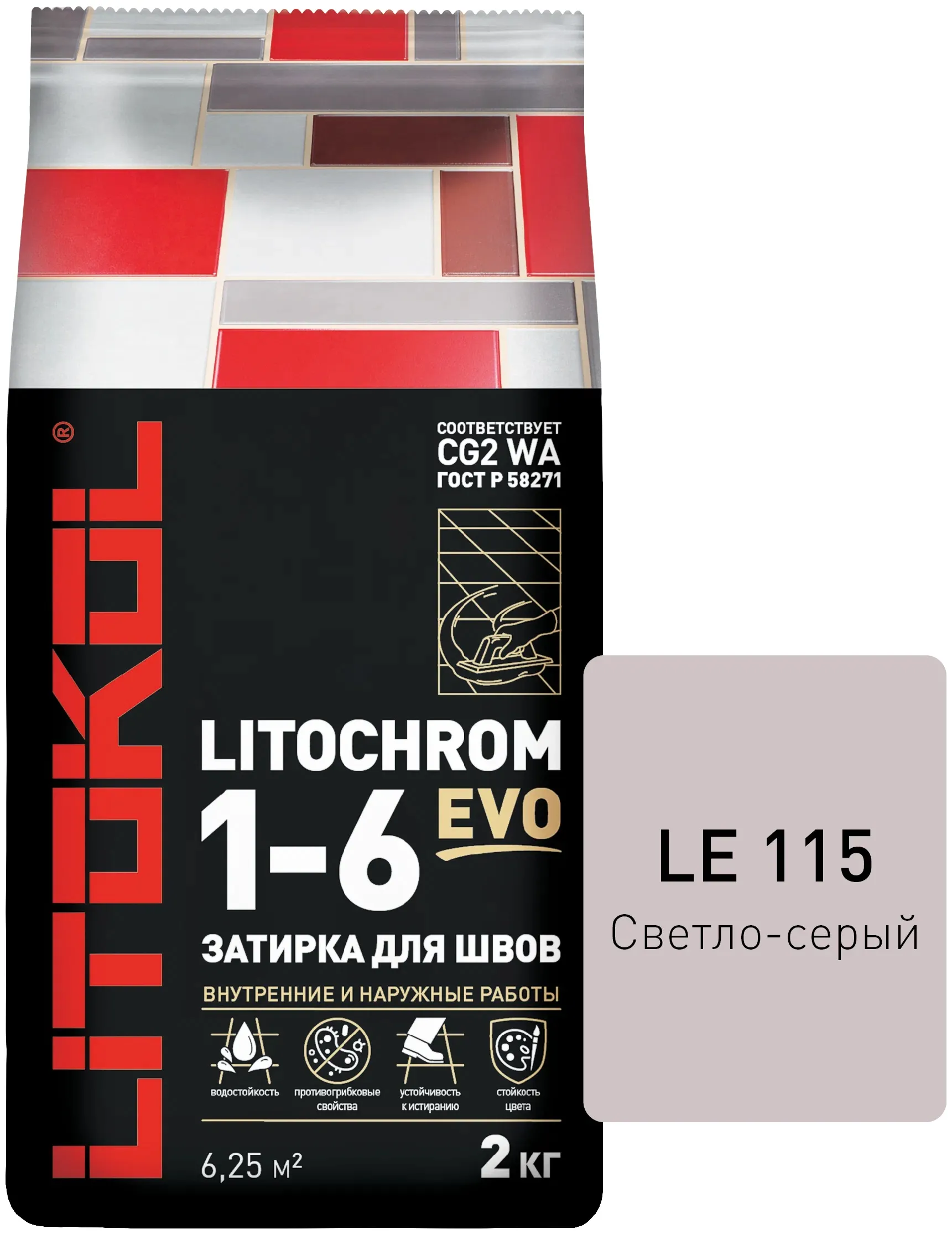 Затирка цементная Litokol Litochrom EVO 1-6 цвет LE 115 Светло-серый 2кг — цветная цементная затирка для заполнения межплиточных швов шириной от 1 до 6 мм с противогрибковыми свойствами. Подходит для внутренних и наружных работ. Для удобства подбора цветов затирки Litochrom 1-6 Evo новая цветовая гамма, состоящая из 20 базовых оттенков, разделена на 2 коллекции WARM (оттенки древесины, песчаника, натурального камня теплых оттенков) и COLD (холодные оттенки серого, бетона, натурального камня).