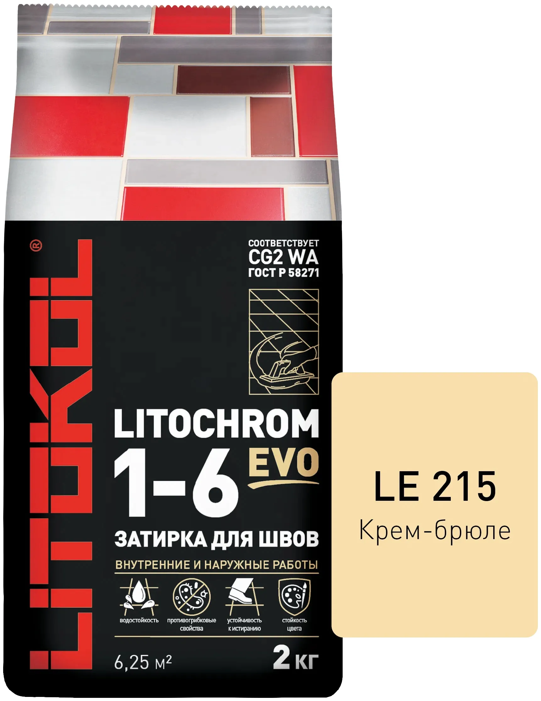 Затирка цементная Litokol Litochrom EVO 1-6 цвет LE 215 Крем-брюле 2кг — цветная цементная затирка для заполнения межплиточных швов шириной от 1 до 6 мм с противогрибковыми свойствами. Подходит для внутренних и наружных работ. Для удобства подбора цветов затирки Litochrom 1-6 Evo новая цветовая гамма, состоящая из 20 базовых оттенков, разделена на 2 коллекции WARM (оттенки древесины, песчаника, натурального камня теплых оттенков) и COLD (холодные оттенки серого, бетона, натурального камня).