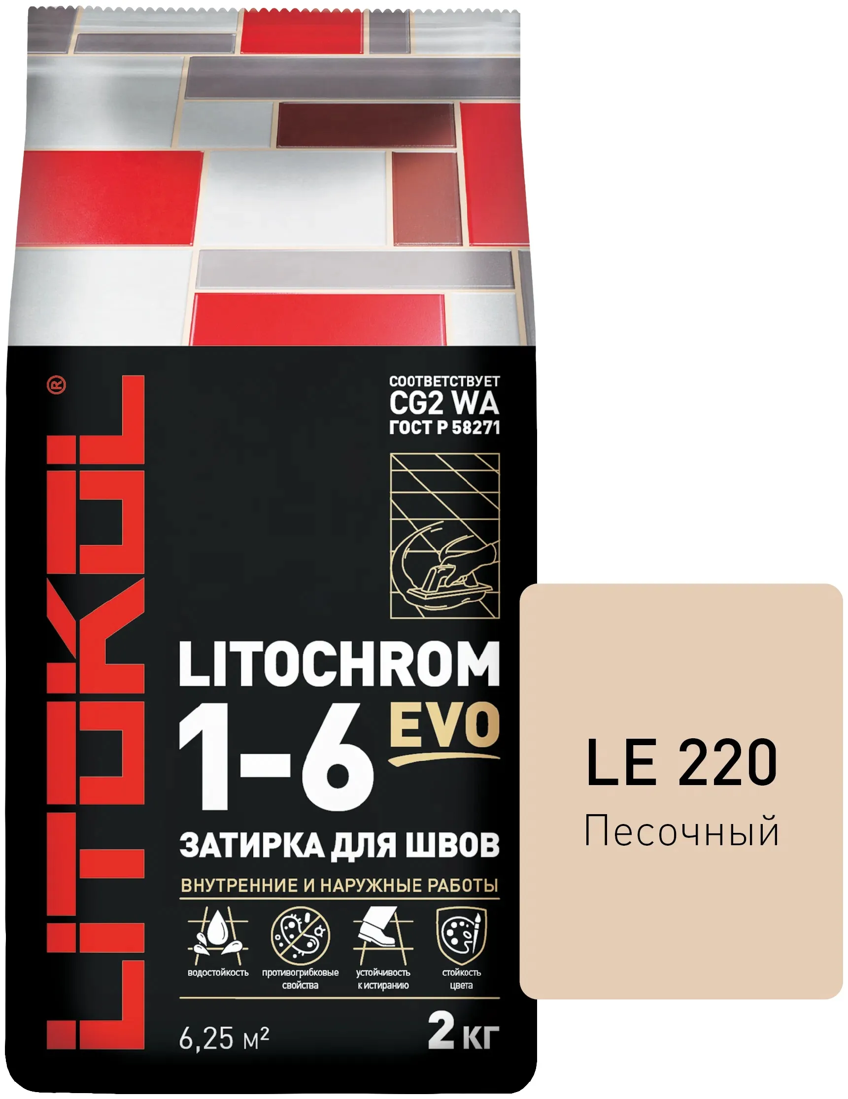 Затирка цементная Litokol Litochrom EVO 1-6 цвет LE 220 Песочный 2кг — цветная цементная затирка для заполнения межплиточных швов шириной от 1 до 6 мм с противогрибковыми свойствами. Подходит для внутренних и наружных работ. Для удобства подбора цветов затирки Litochrom 1-6 Evo новая цветовая гамма, состоящая из 20 базовых оттенков, разделена на 2 коллекции WARM (оттенки древесины, песчаника, натурального камня теплых оттенков) и COLD (холодные оттенки серого, бетона, натурального камня).